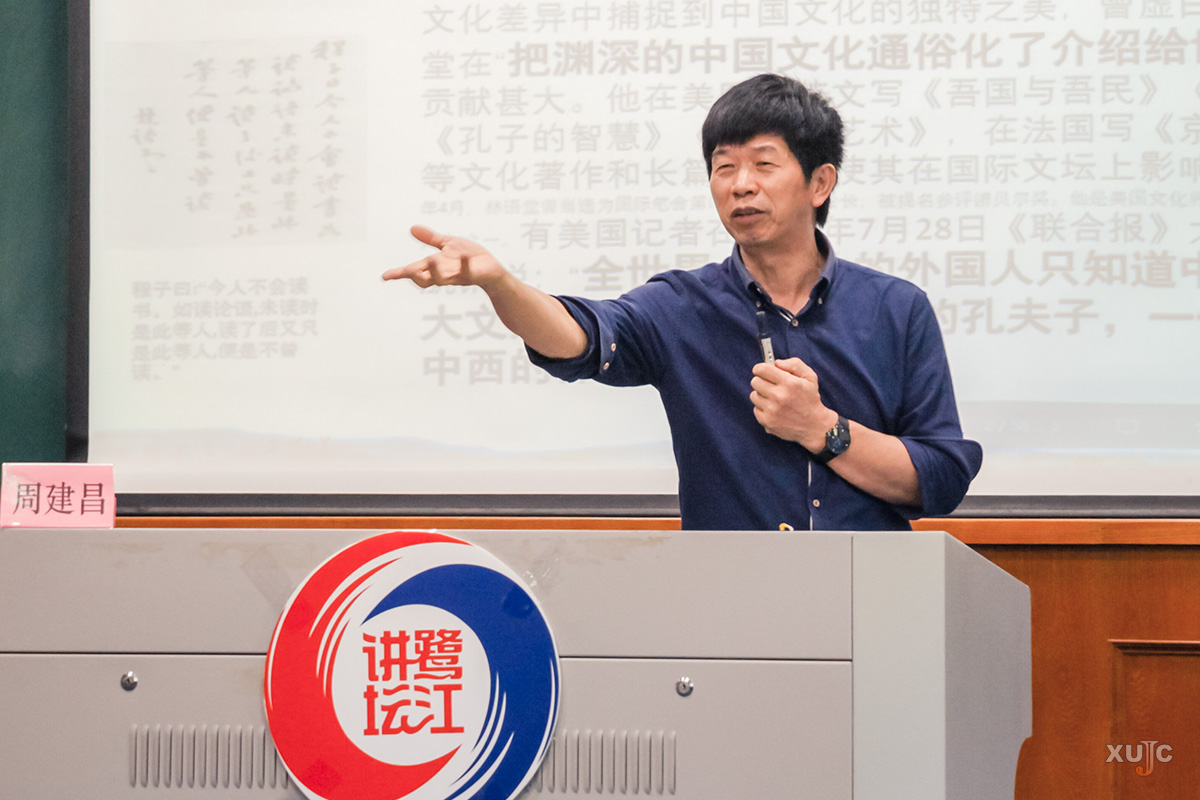 讲座伊始,周建昌对林语堂的生平做了介绍,内容包括林语堂的祖父母和父母、林语堂与廖翠凤的美妙姻缘等,并用一张年谱清晰明了地向大家展示了林语堂的一生轨迹。随后,周建昌从“家的回归”“高地的人生观”“故乡情结”等十二个方面具体阐述林语堂的爱国思想及爱国实践。